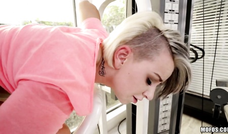 Лысенький парень самый лучший тренер по фитнесу в этом городке. В этом абсолютно уверен не только он сам, но и привлекательная телка с стоячими сиськами, которая пару раз в неделю приходит потренироваться. Впрочем тренажеры милашке вообще то не сильно волнуют и гораздо больше ее волнует большой член мужика, которым тот трахает кокетку в разных позах.
